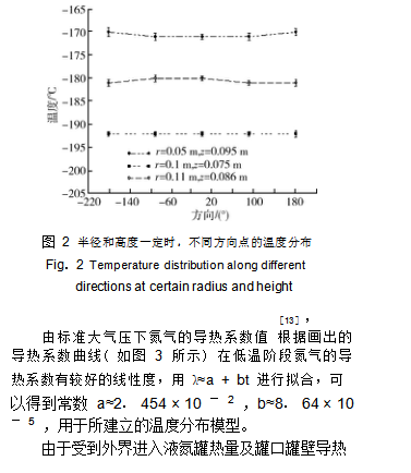 作為靈活方便,可移動的超低溫系統(tǒng),裝有部分液氮的液氮罐為非接觸性保存某些特殊樣品提供一個簡便、低成本的超低溫環(huán)境,在生物、材料、醫(yī)學(xué)和科研等*域有著廣泛的應(yīng)用。本文通過對裝有部分液氮的 10 L 液氮罐內(nèi)空間溫度場的測量和分析,建立了相應(yīng)的溫度分布模型。 - 195. 8 ℃ 的液氮作為低溫源存在于罐內(nèi)底部,保證了低溫環(huán)境的存在,在外部室溫恒定的情況下,液氮罐通過對流或內(nèi)壁熱傳導(dǎo)從外空間帶進(jìn)罐內(nèi)熱量,氮氣分子從罐口逸出并帶走熱量,二者的平衡保證了罐內(nèi)空間溫度分布的相對穩(wěn)定。研究表明,在罐內(nèi)注入少量液氮 ( 4 L 以下)