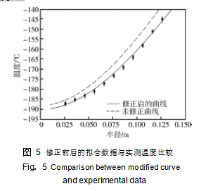 對液氮罐內(nèi)溫度的初步擬合表明,溫度的計算結(jié)果與實測數(shù)值間存在一定誤差,鑒于溫度測量所用的鉑電阻探頭的感溫段長度有 22. 0 mm 長,要測的是空間點的溫度,而實際的溫度是該長度上的平均溫度。因此,考慮溫度在這段長度上的變化,取這段鉑電阻的中點的溫度作為實測點的溫度,從而對計算結(jié)果進(jìn)行修正。修正后典型的擬合溫度如圖 5 所示,修正的結(jié)果減小了擬合與實測溫度值之間的誤差,提高了擬合的精度。這也可從圖 4 中的結(jié)果得到驗證,軸向溫度的實測值與理論計算得到的結(jié)果兩者符合得