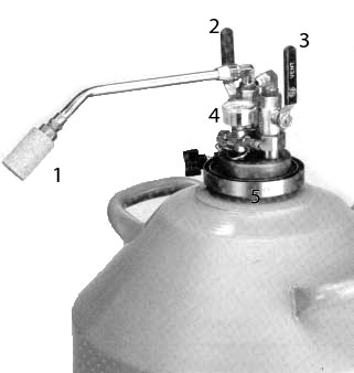 使用液體抽取裝置液氮罐。1)低溫相分離器(確實,他們稱其為“以后”)。2)液體閥。3)排氣閥。4)壓力表和安全泄壓閥。5)夾緊帶。